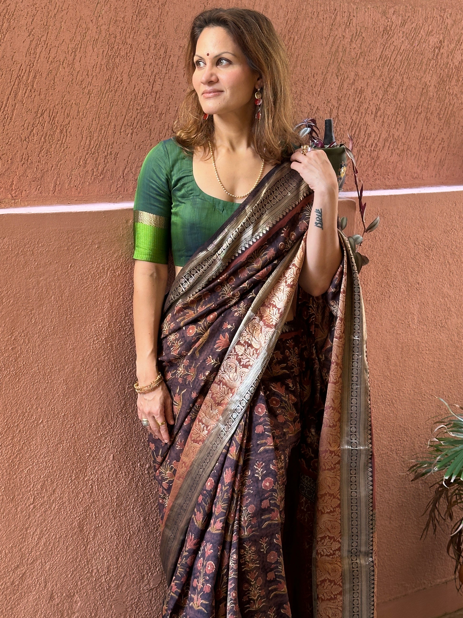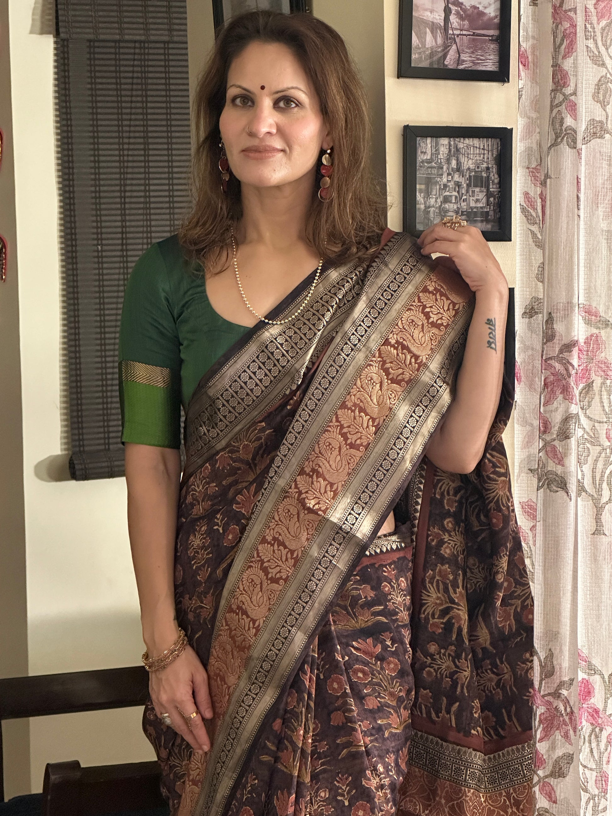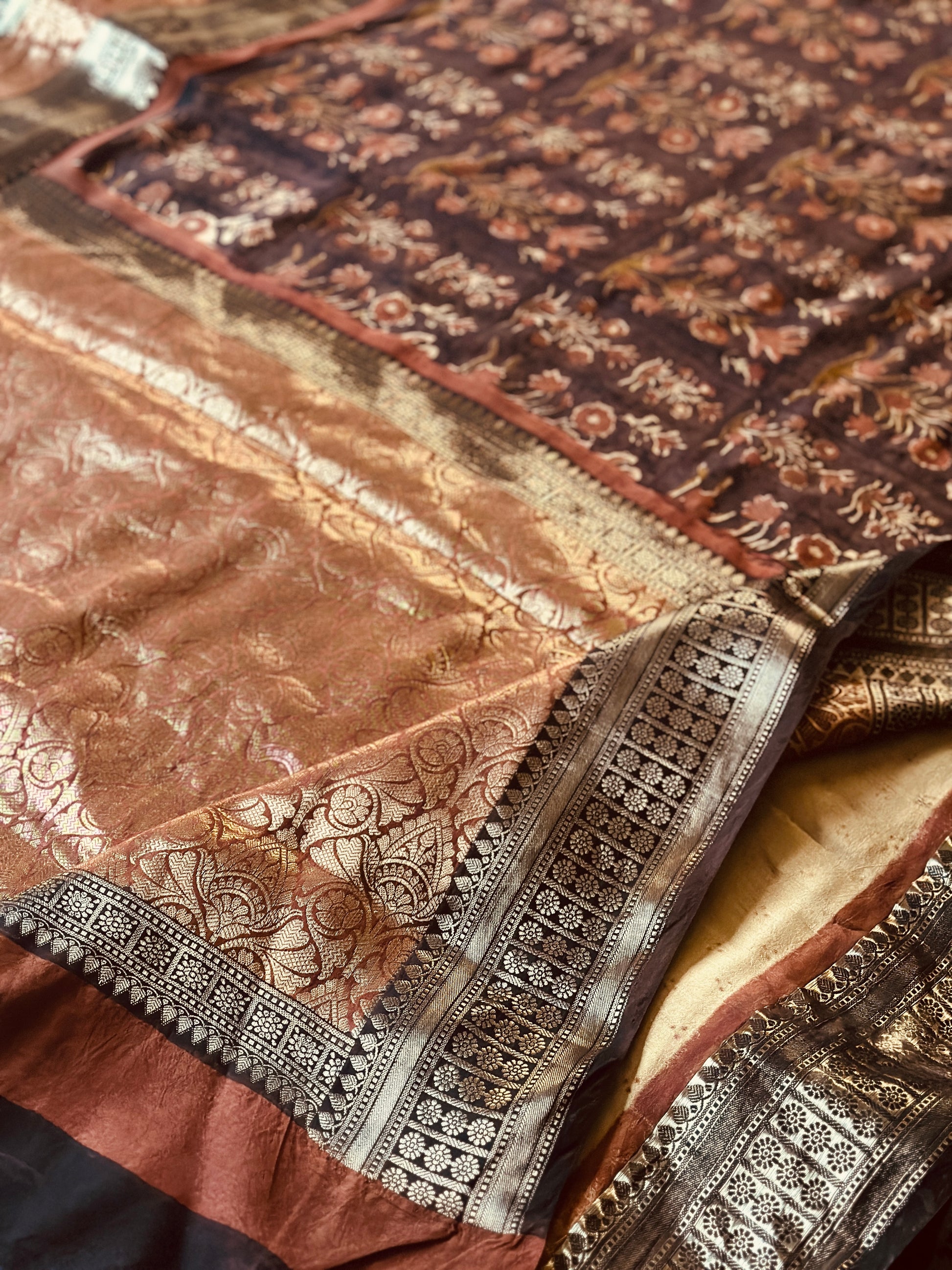 Brown Handblock Print Chanderi Silk Saree with Thick Zari Woven Border & Rich Zari Pallu