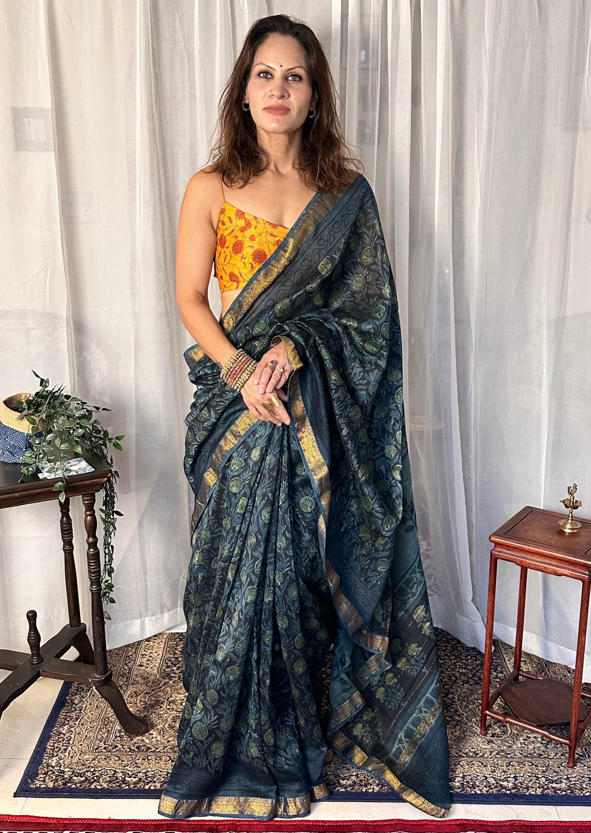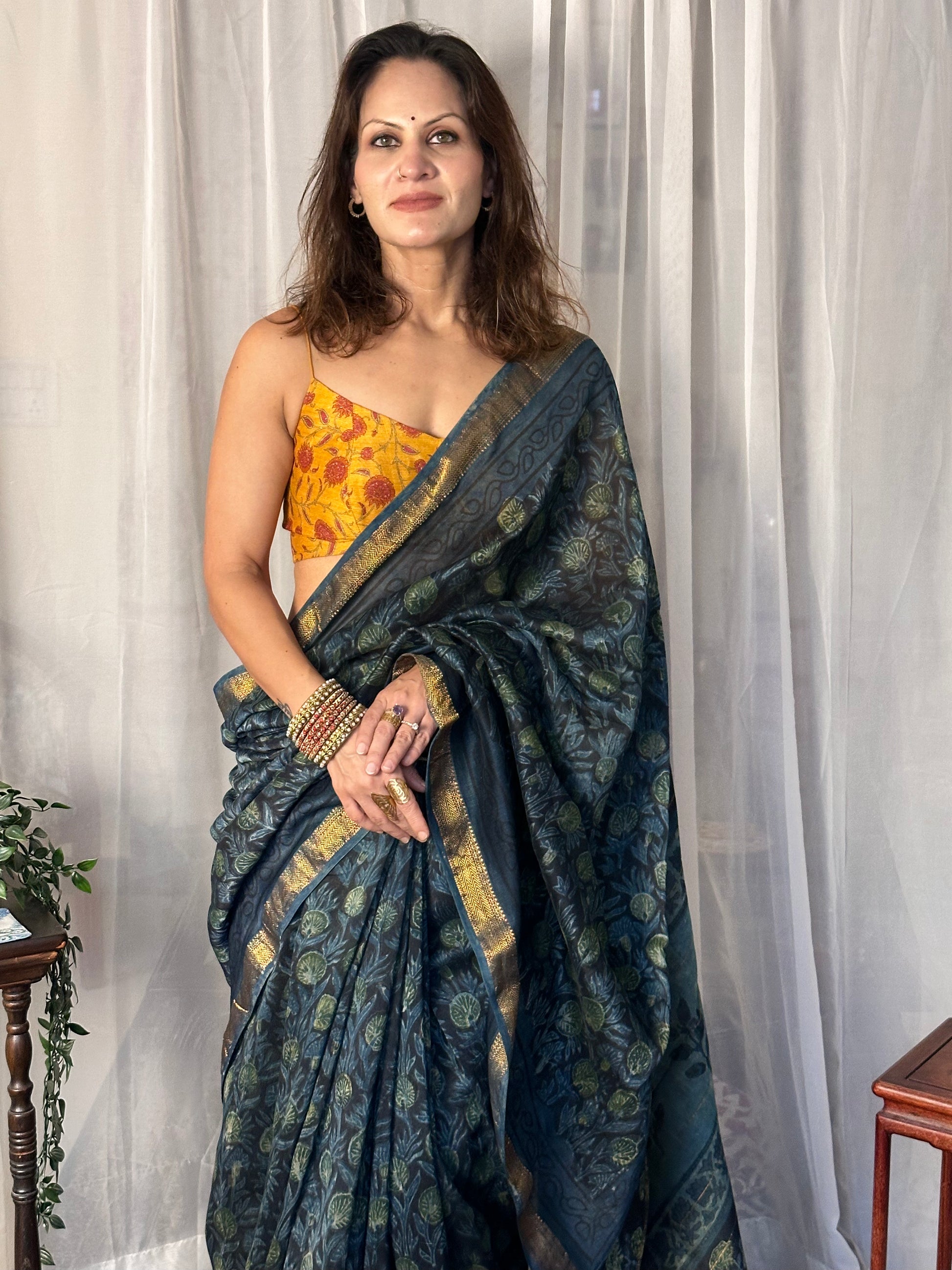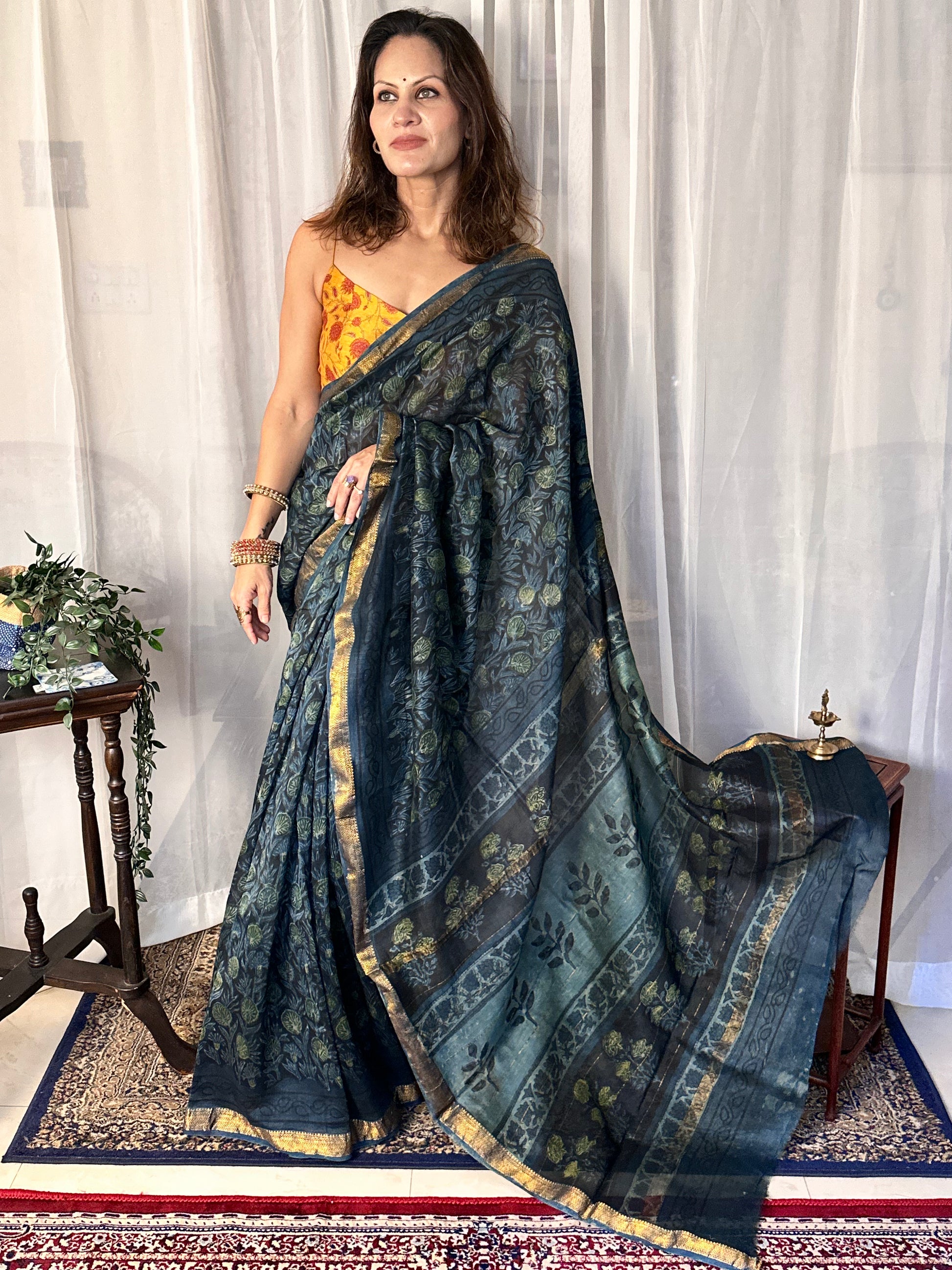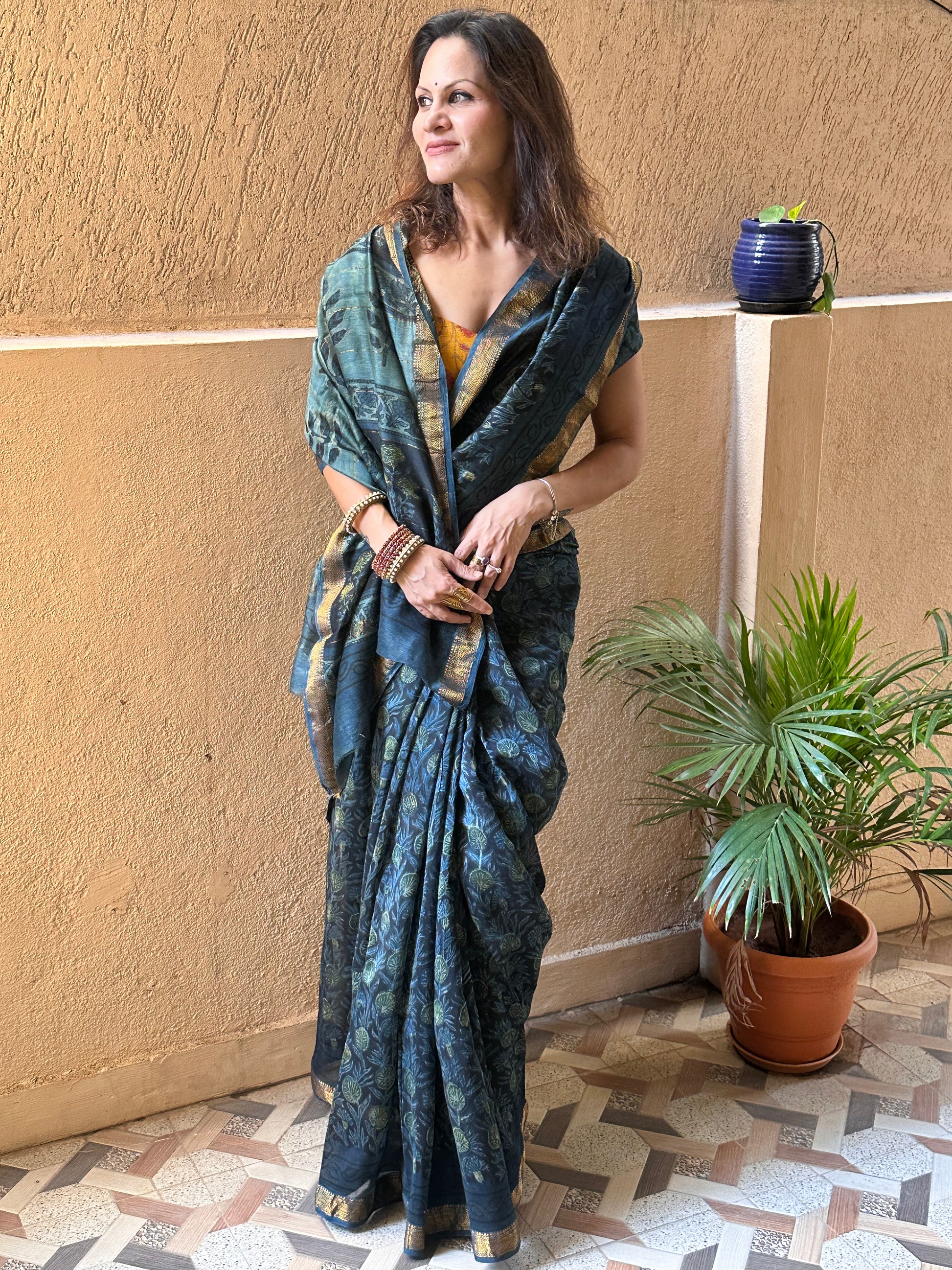 Indigo Green Natural Vanaspati Block Print Maheshwari Sari with Zari Border