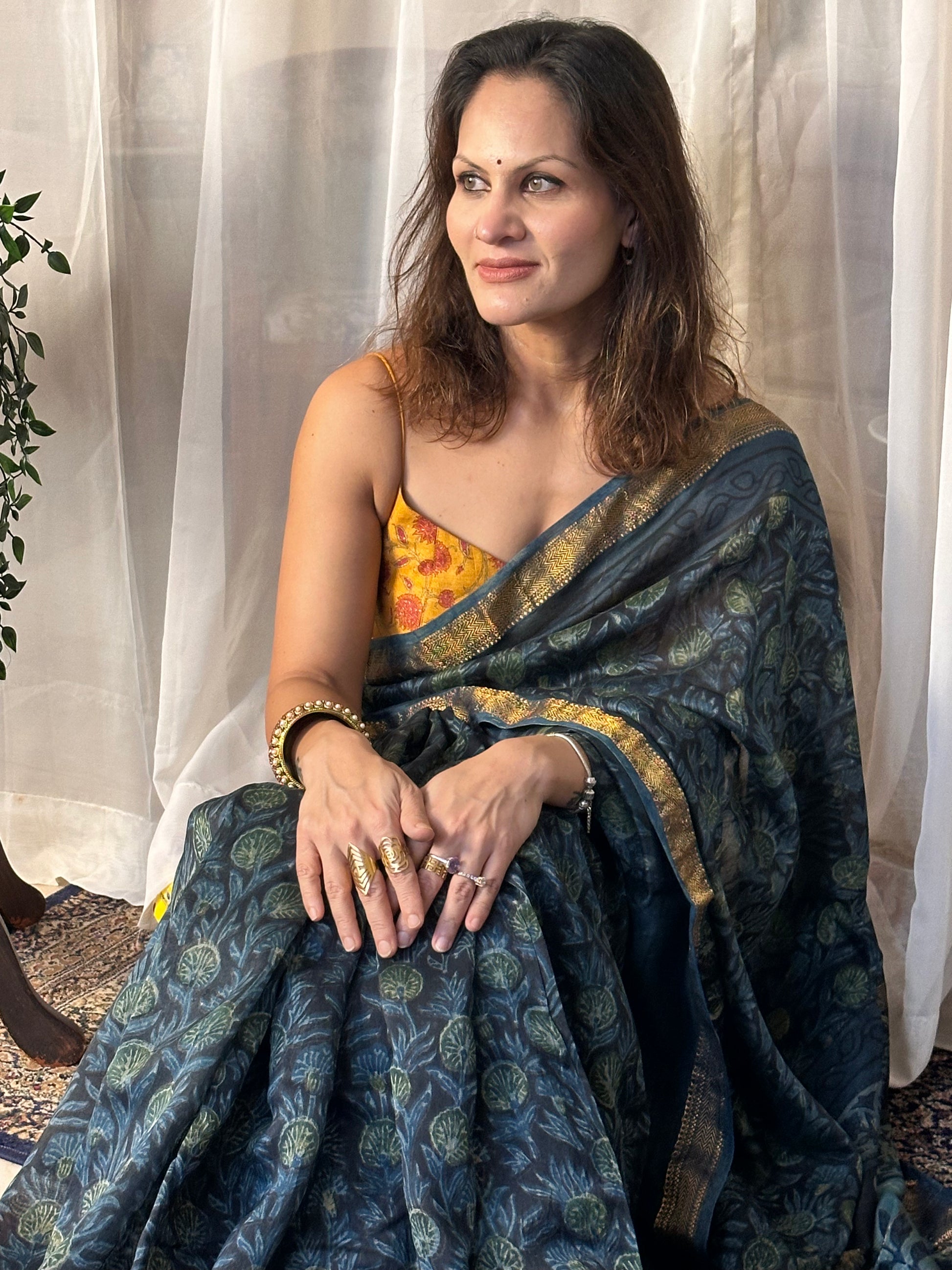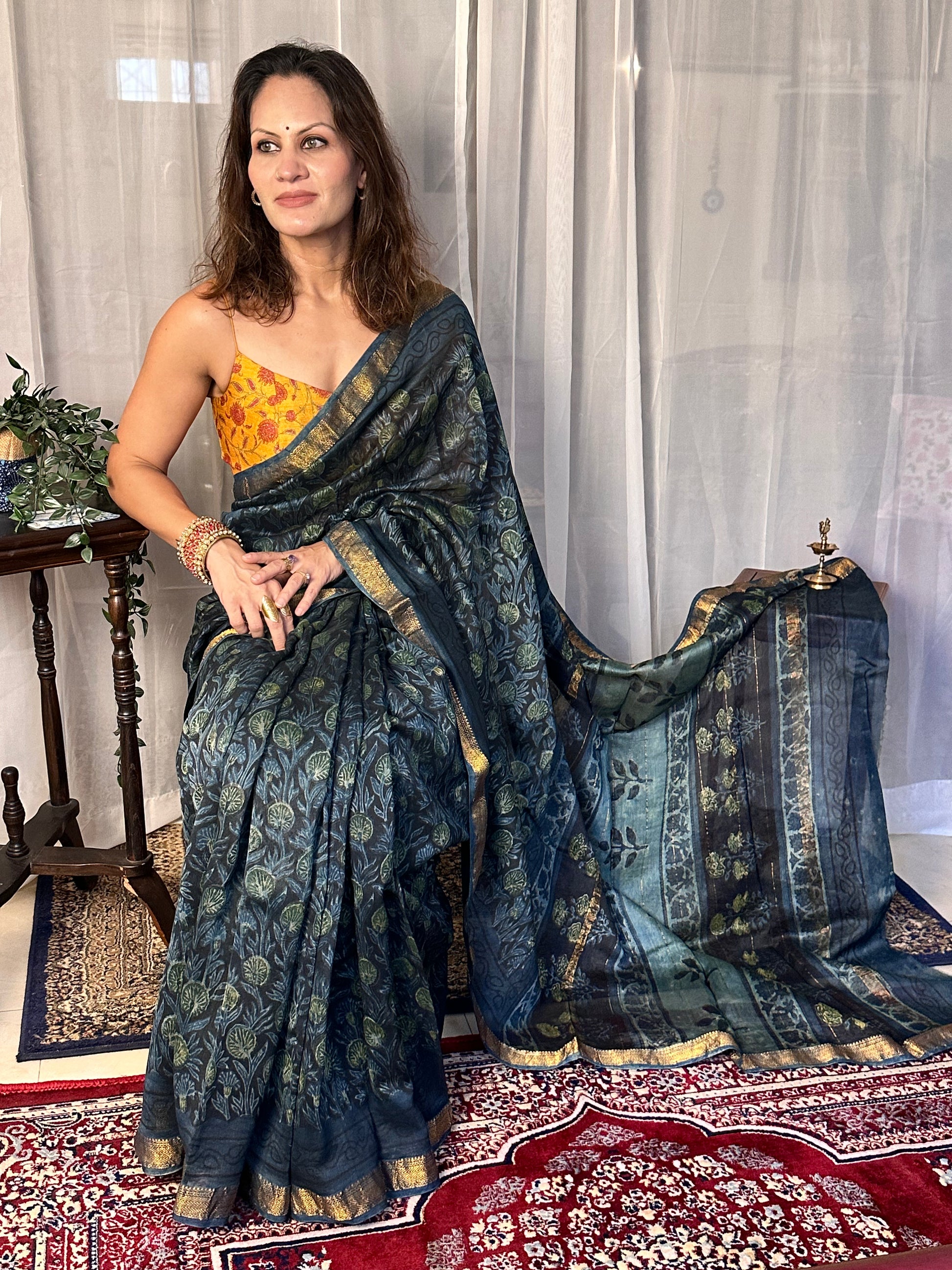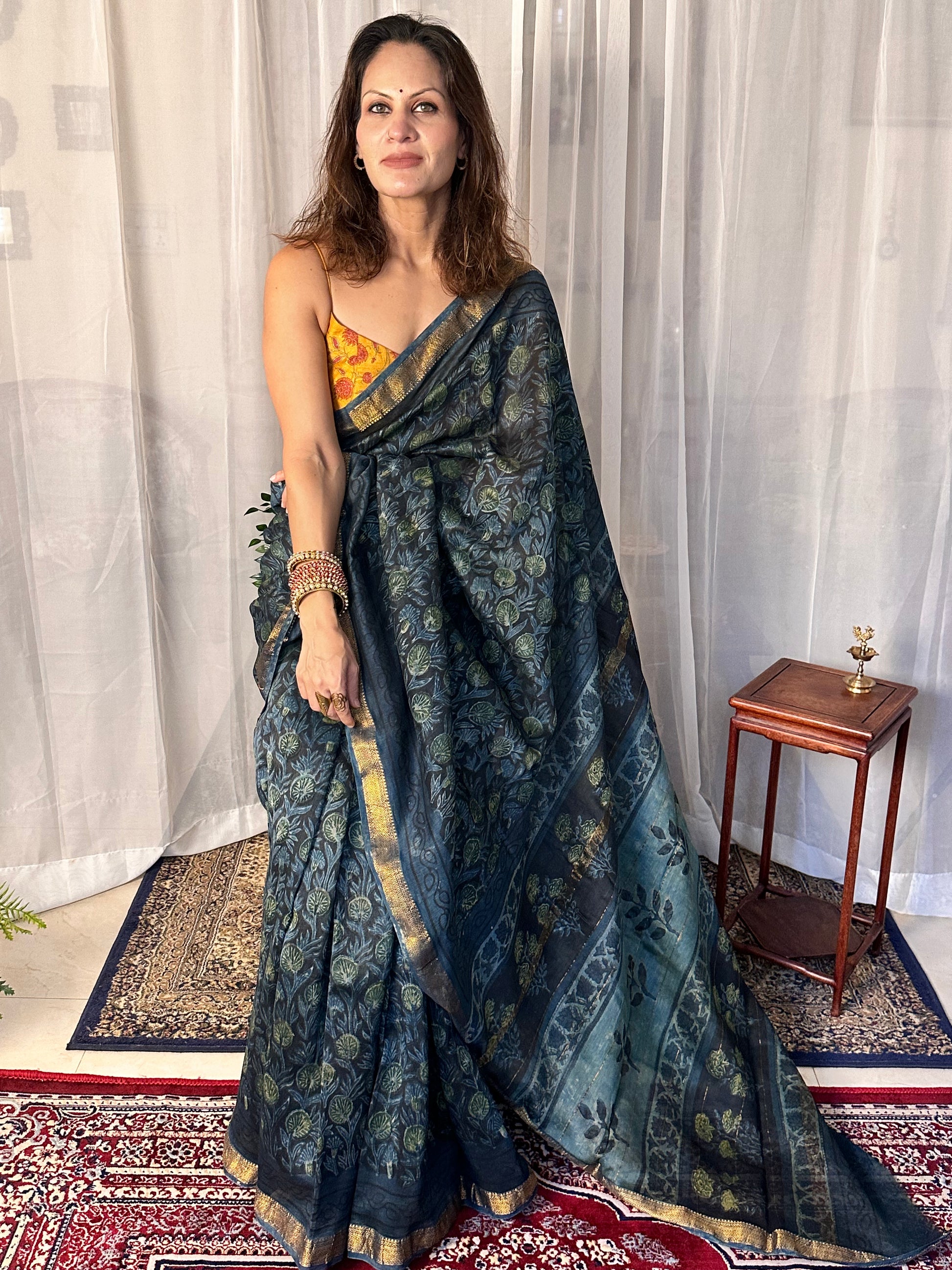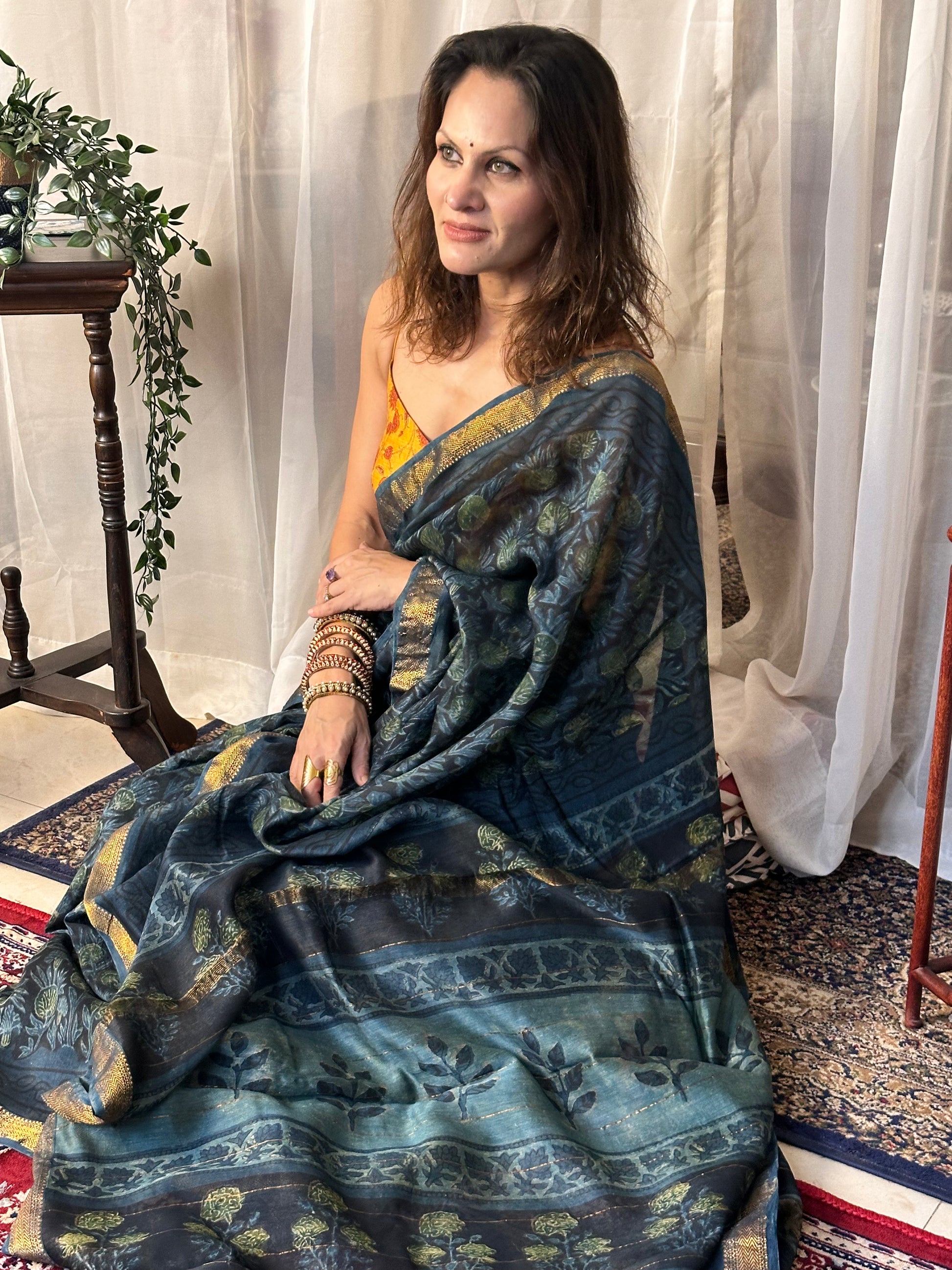 Indigo Green Natural Vanaspati Block Print Maheshwari Sari with Zari Border