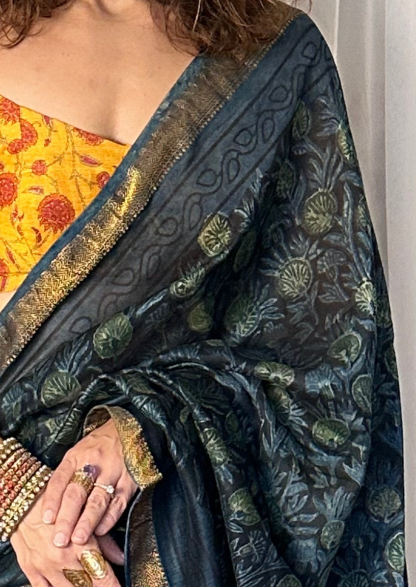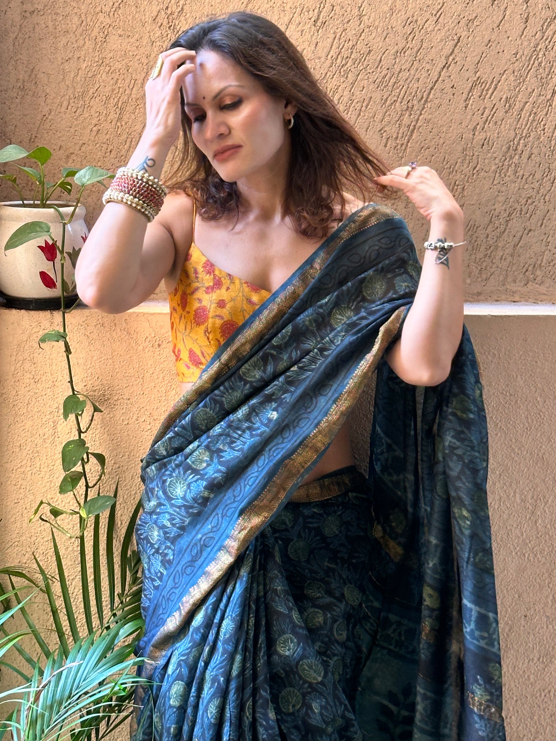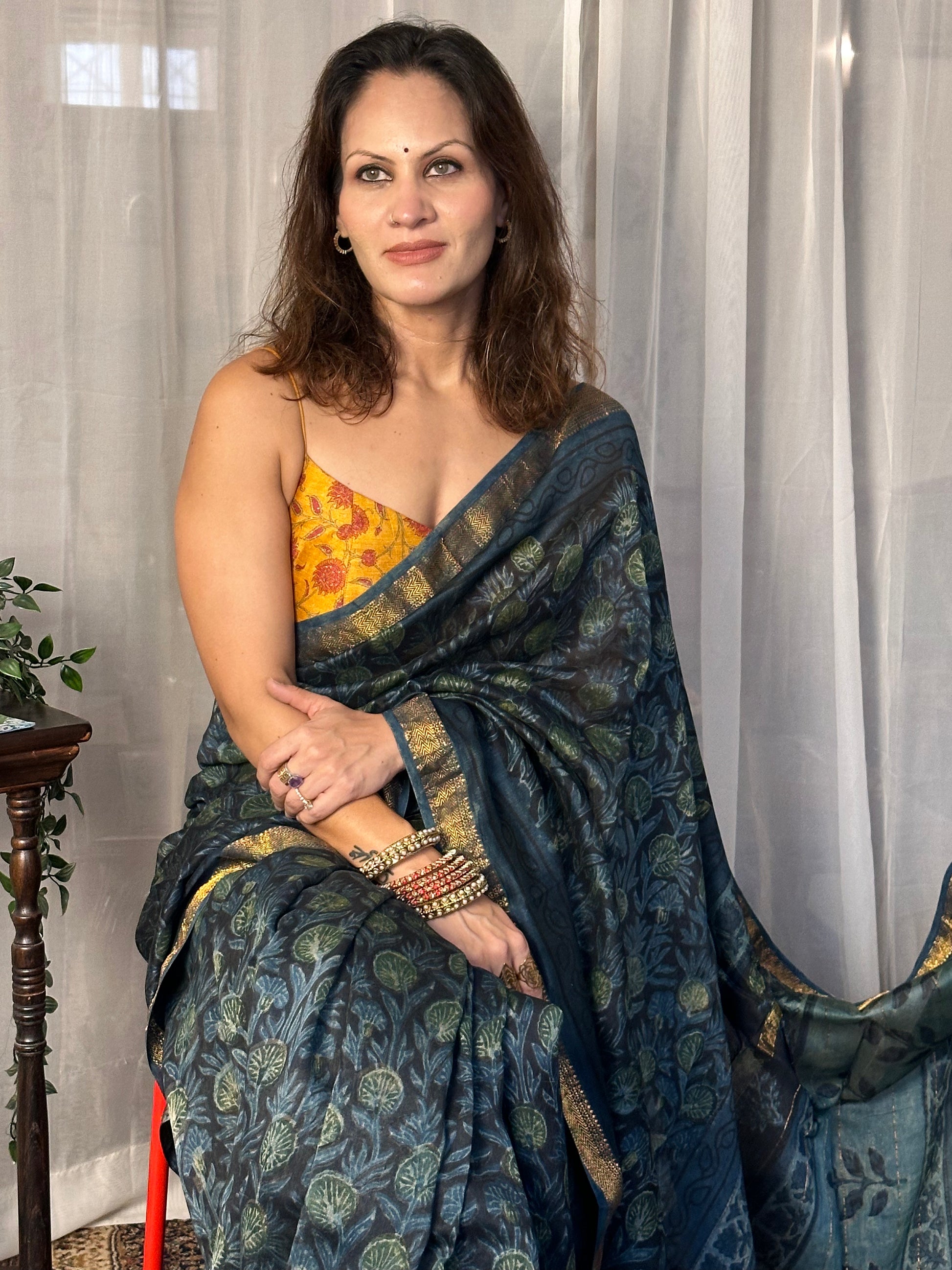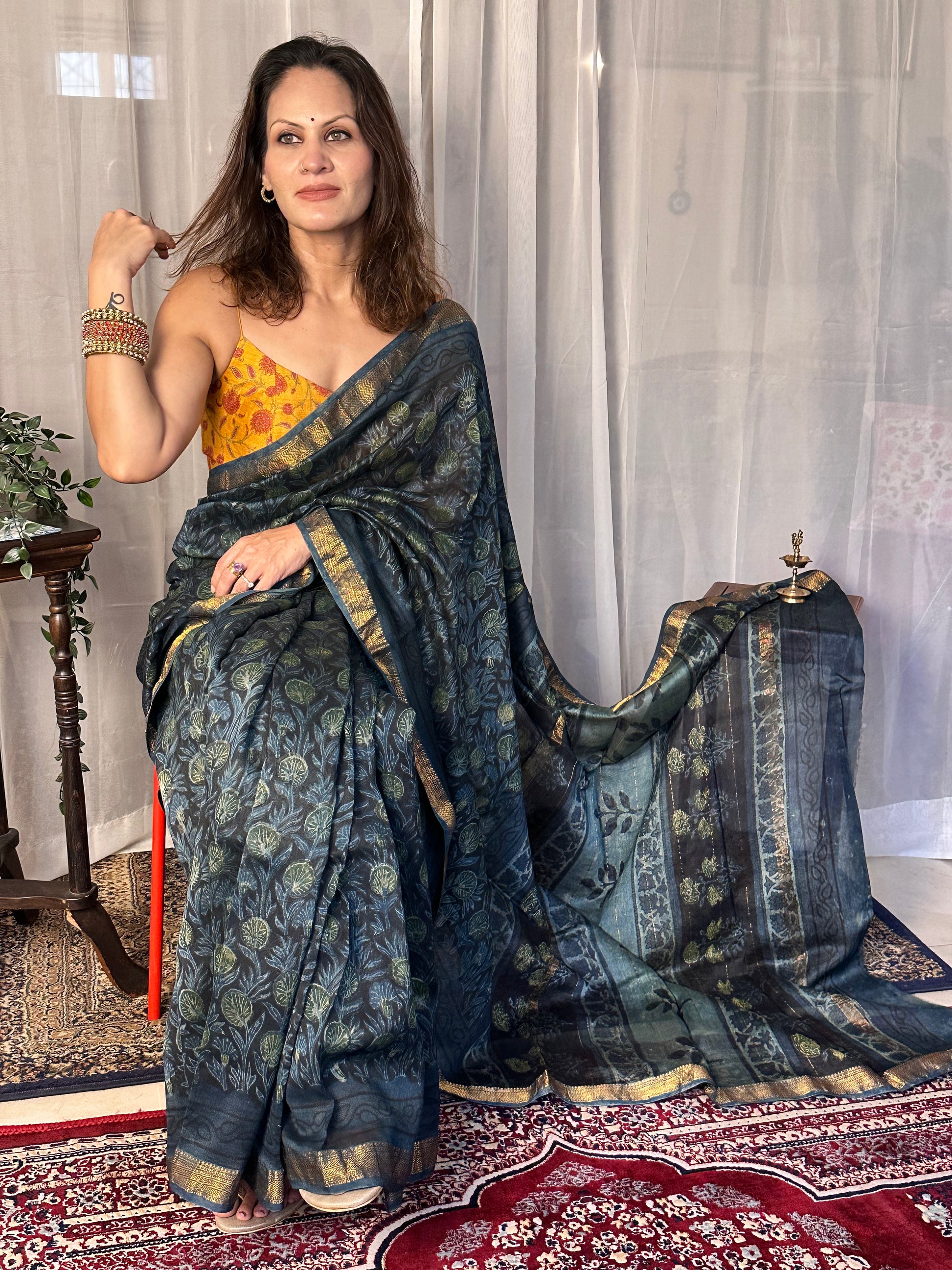 Indigo Green Natural Vanaspati Block Print Maheshwari Sari with Zari Border