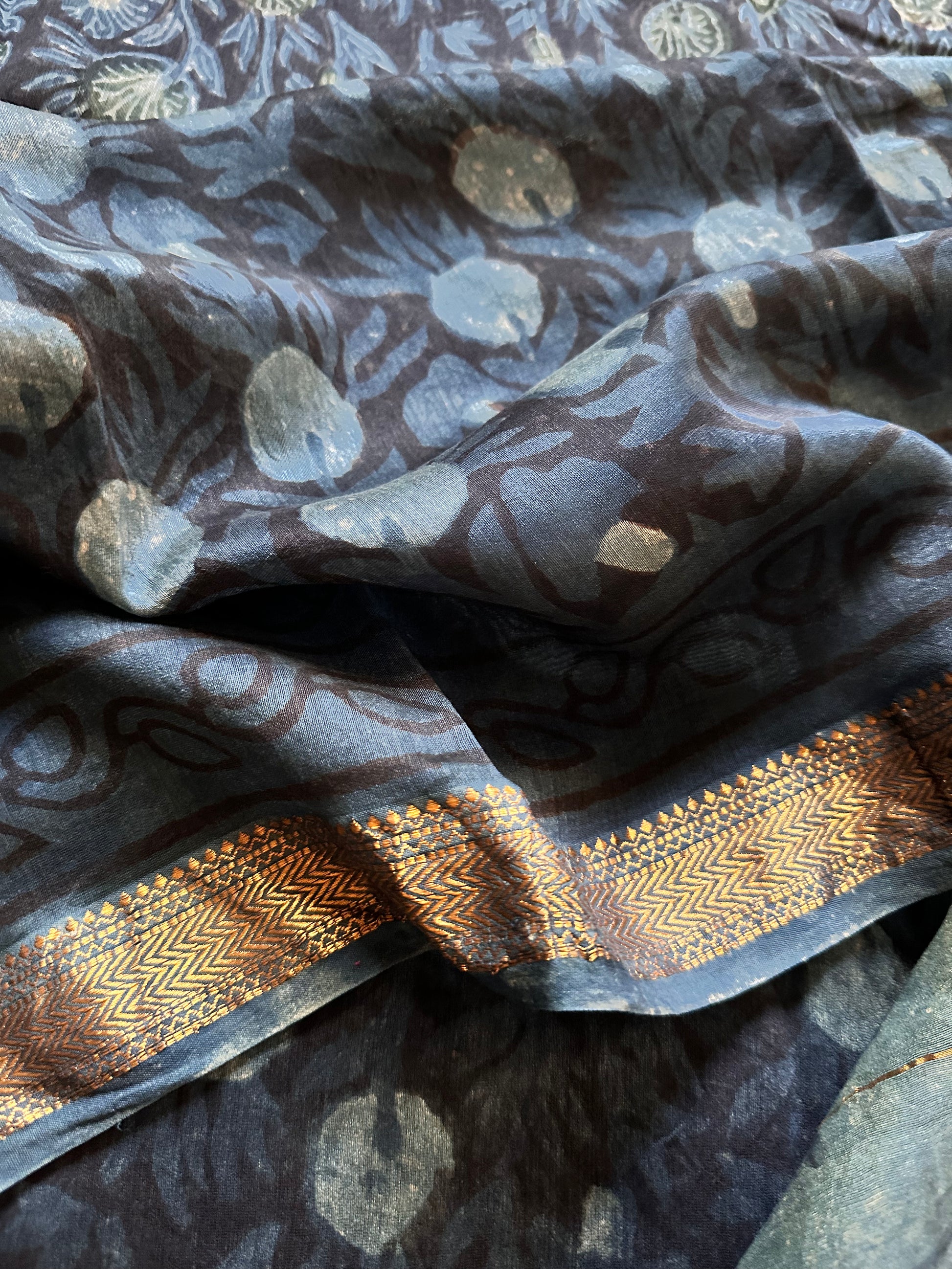 This indigo natural dyed, stunning, Vanaspati block print Maheshwari sari is sure to draw the eye! The sari comes with a stunning zari border. Its soft beauty is perfect for any special occasion, and is sure to make you the center of attention. So go ahead and give it a twirl—you'll be looking oh-so-chic!