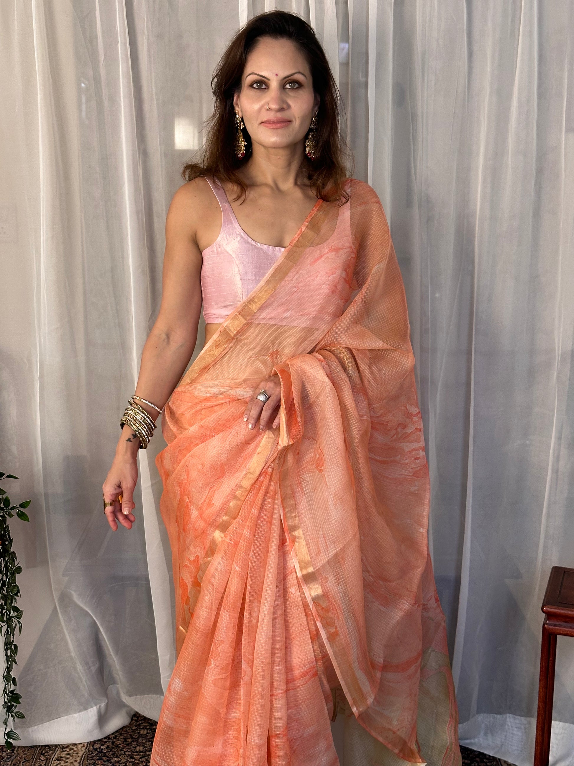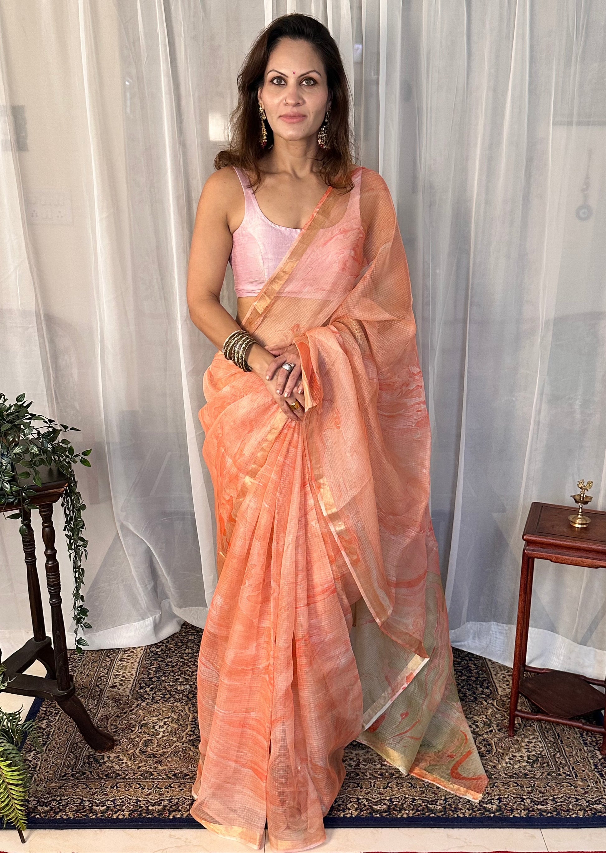 Discover this timeless classic - our gorgeous hand dyed marble hand print Kota silk sari in peach colour! Crafted in a modern style with a touch of tradition, it's sure to add sophistication to any occasion.