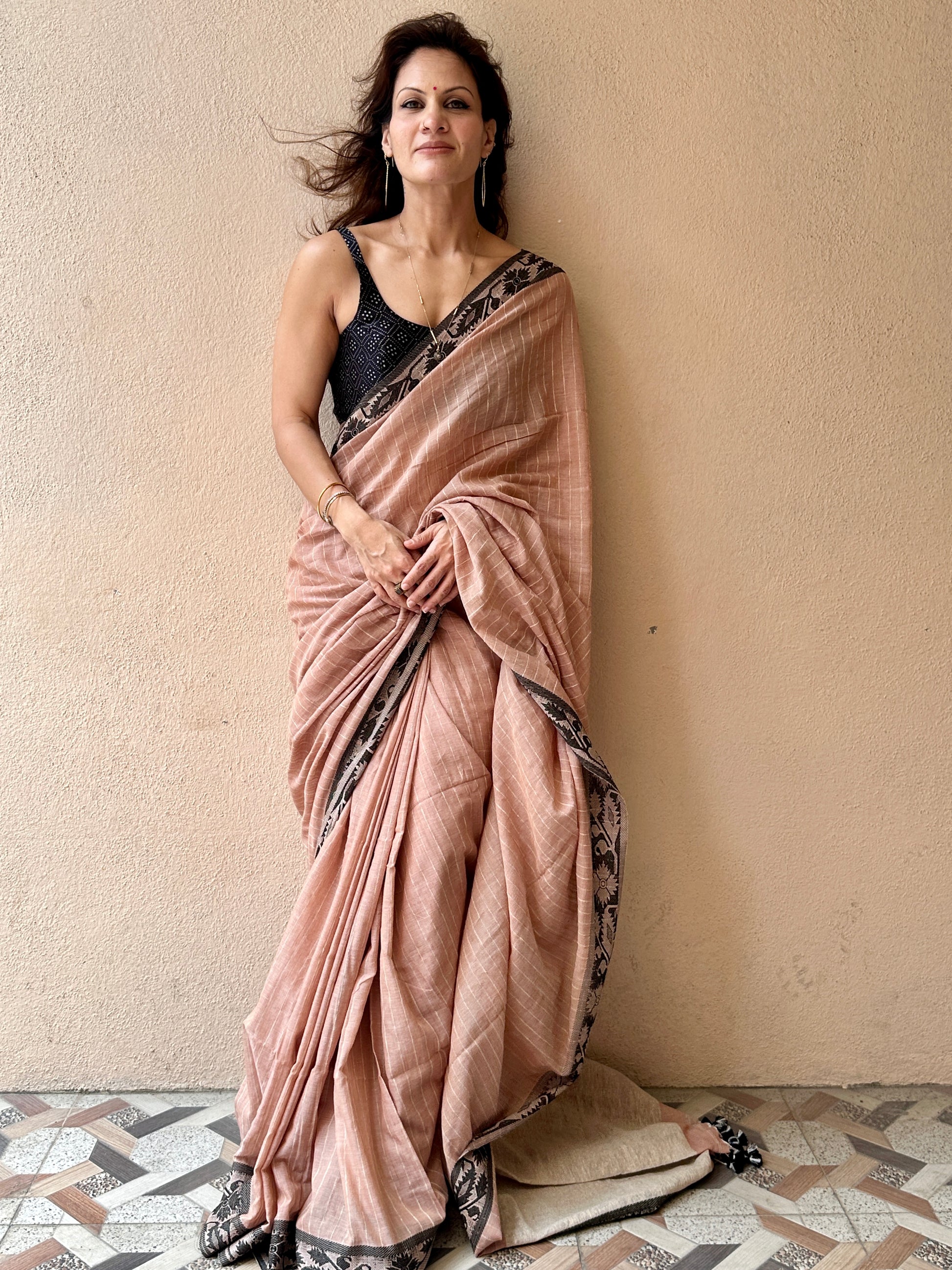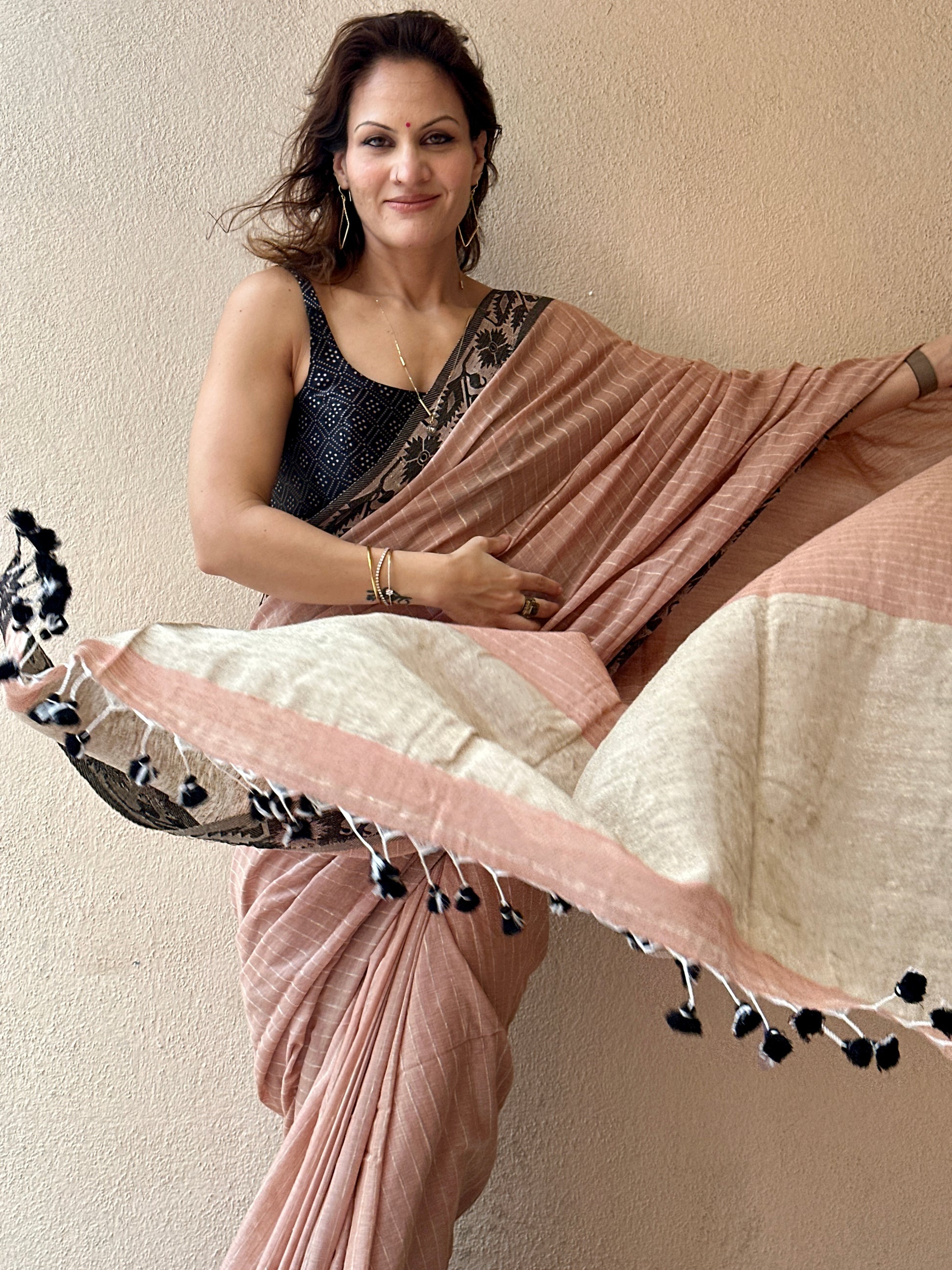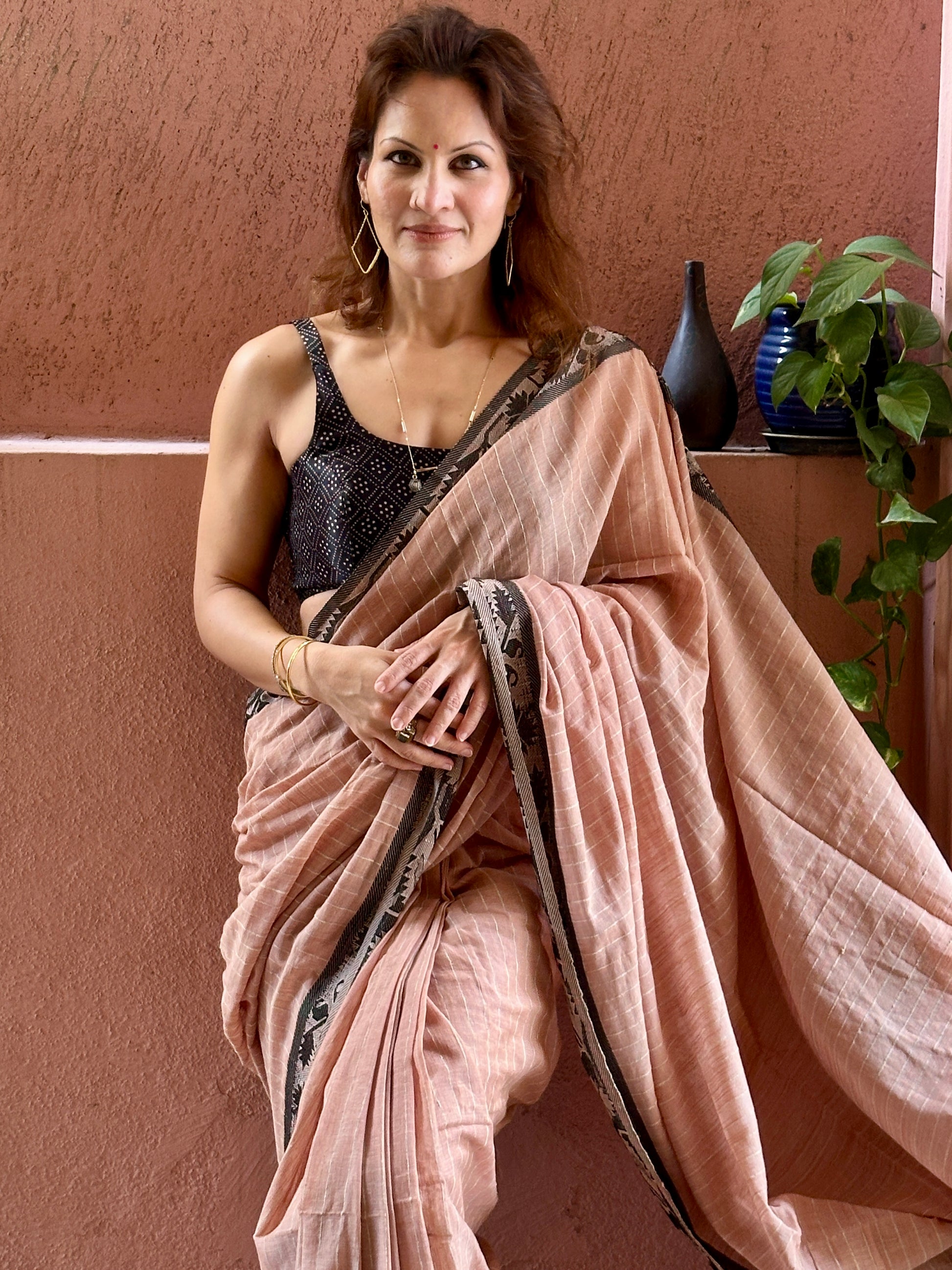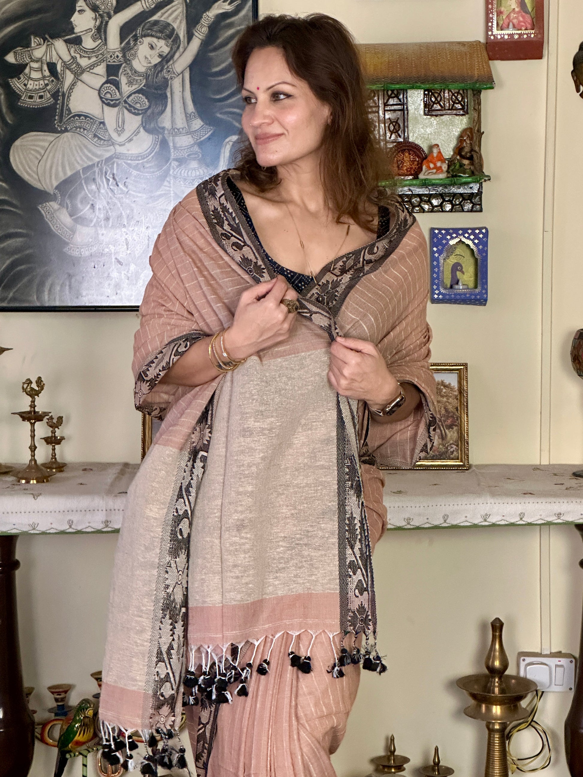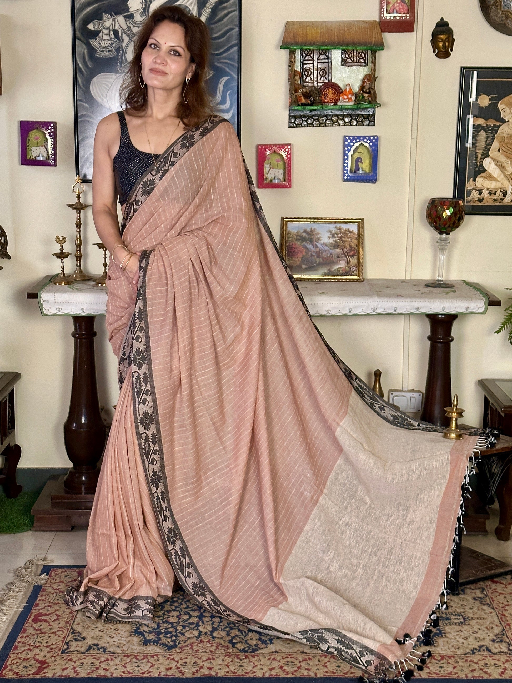 Peach Pure Handloom Cotton Saree with Gicha Stripes and Pallu