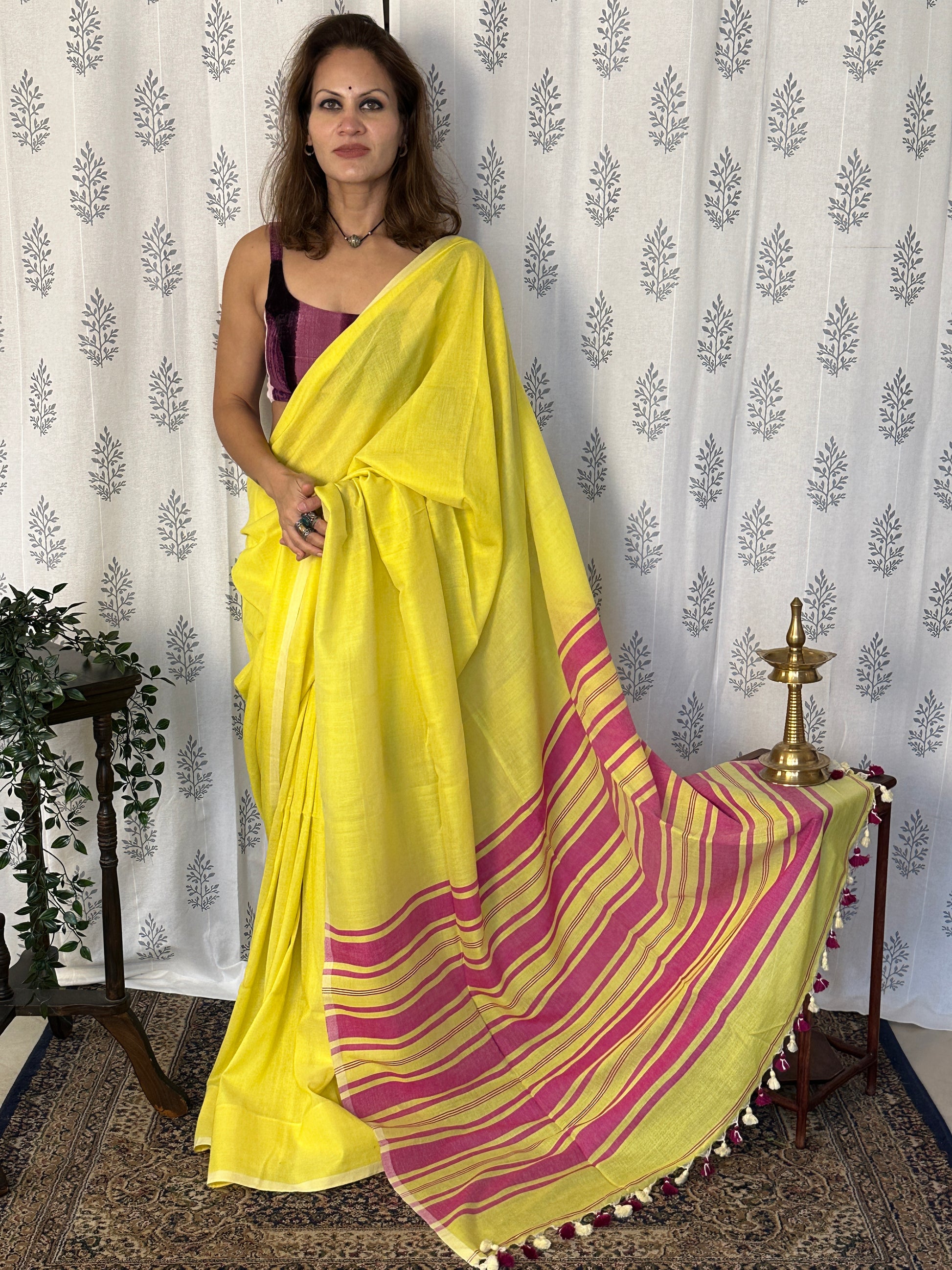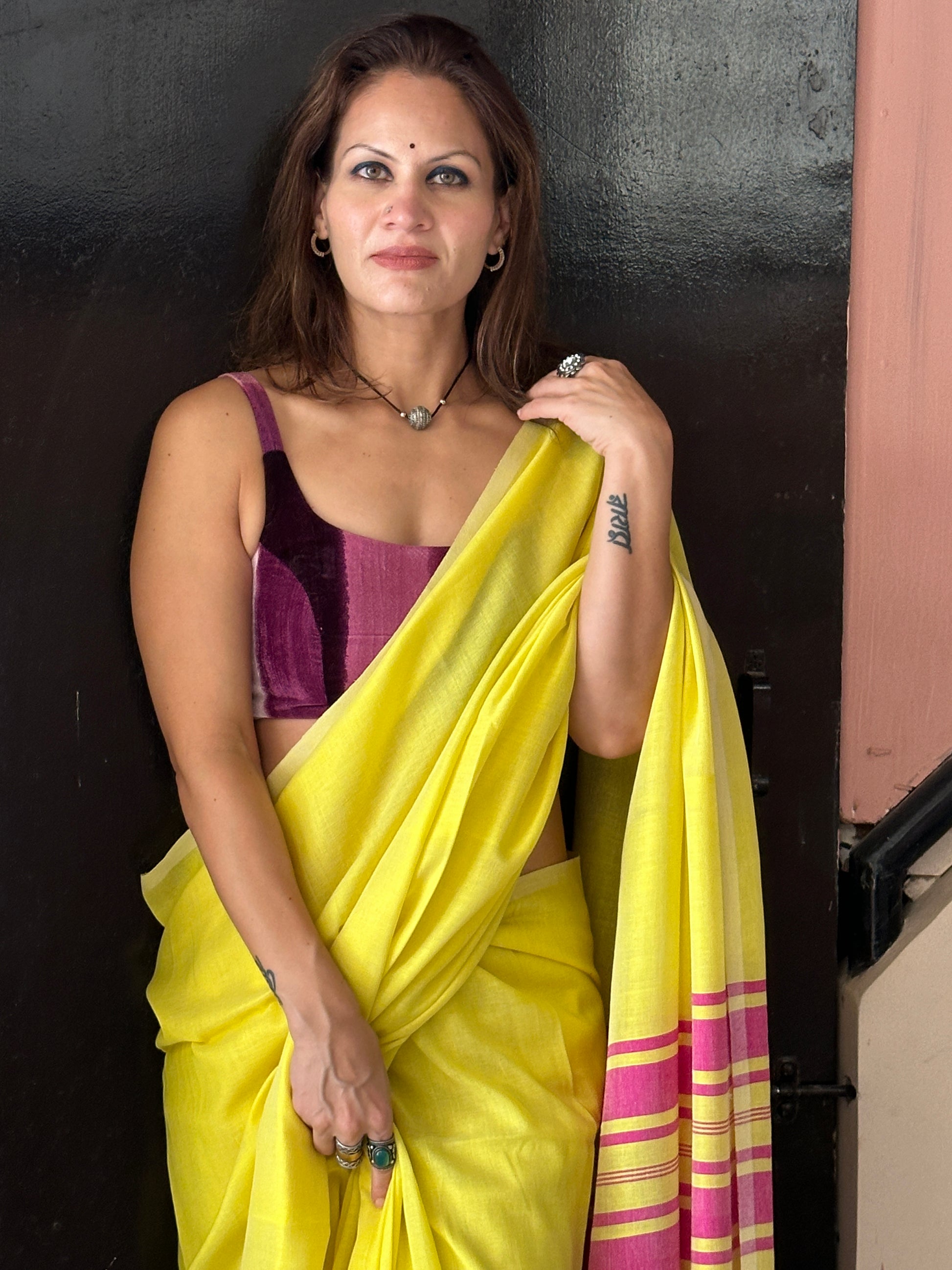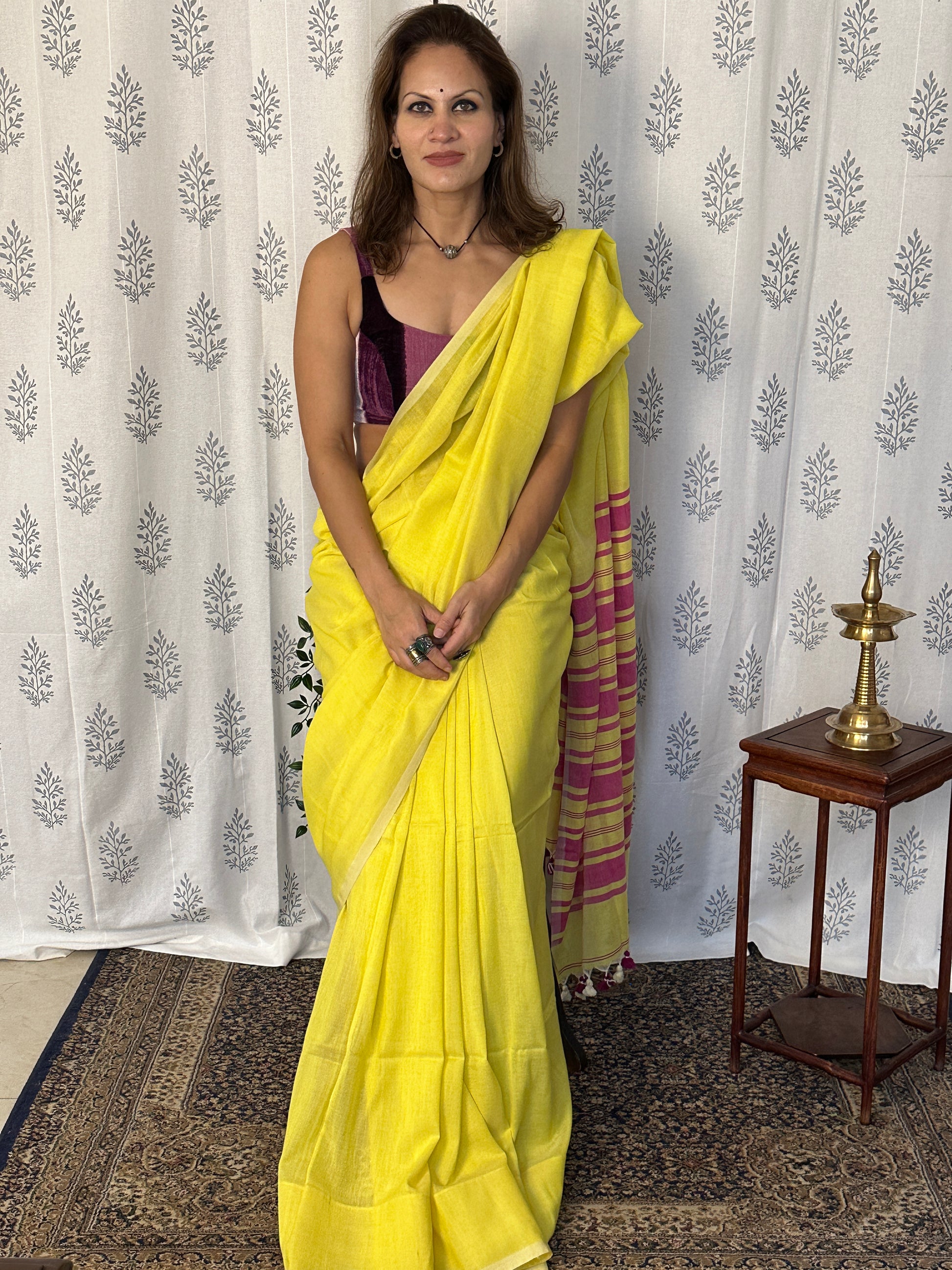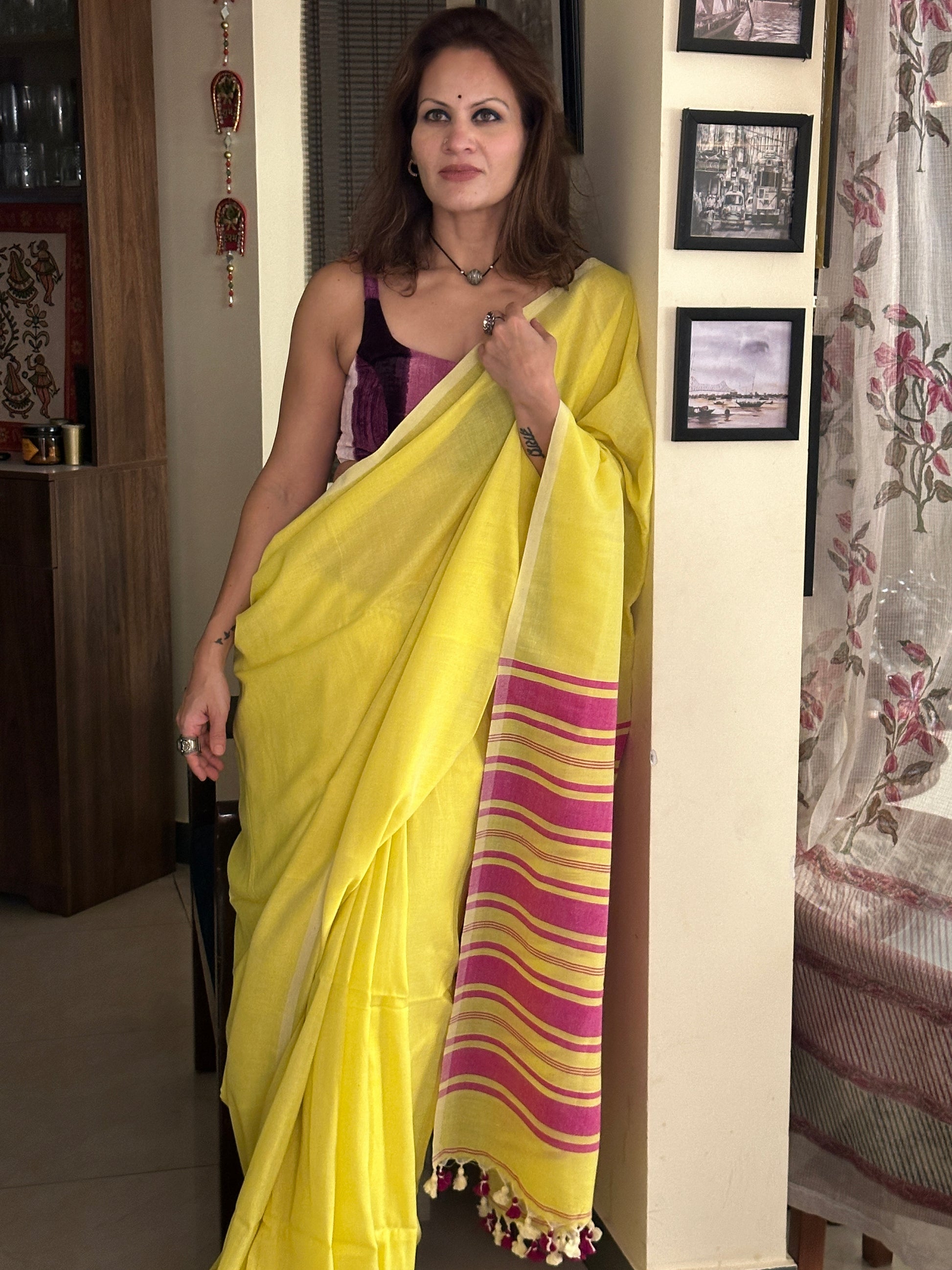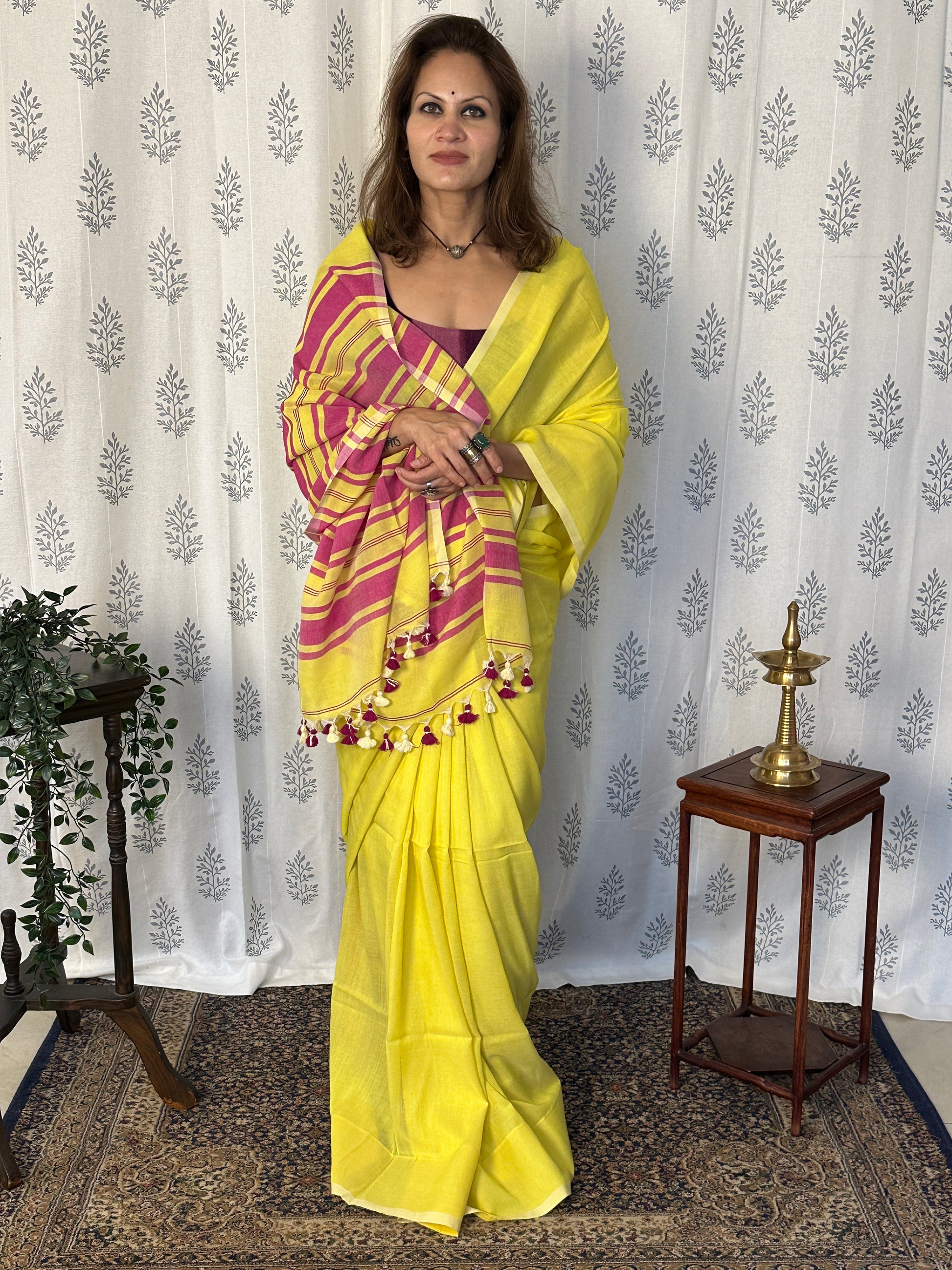 Experience the perfect combination of softness and style with a luxurious cotton and wool blend. The pallu of this sari is adorned with beautiful handmade tassels that are sure to elevate your entire look!