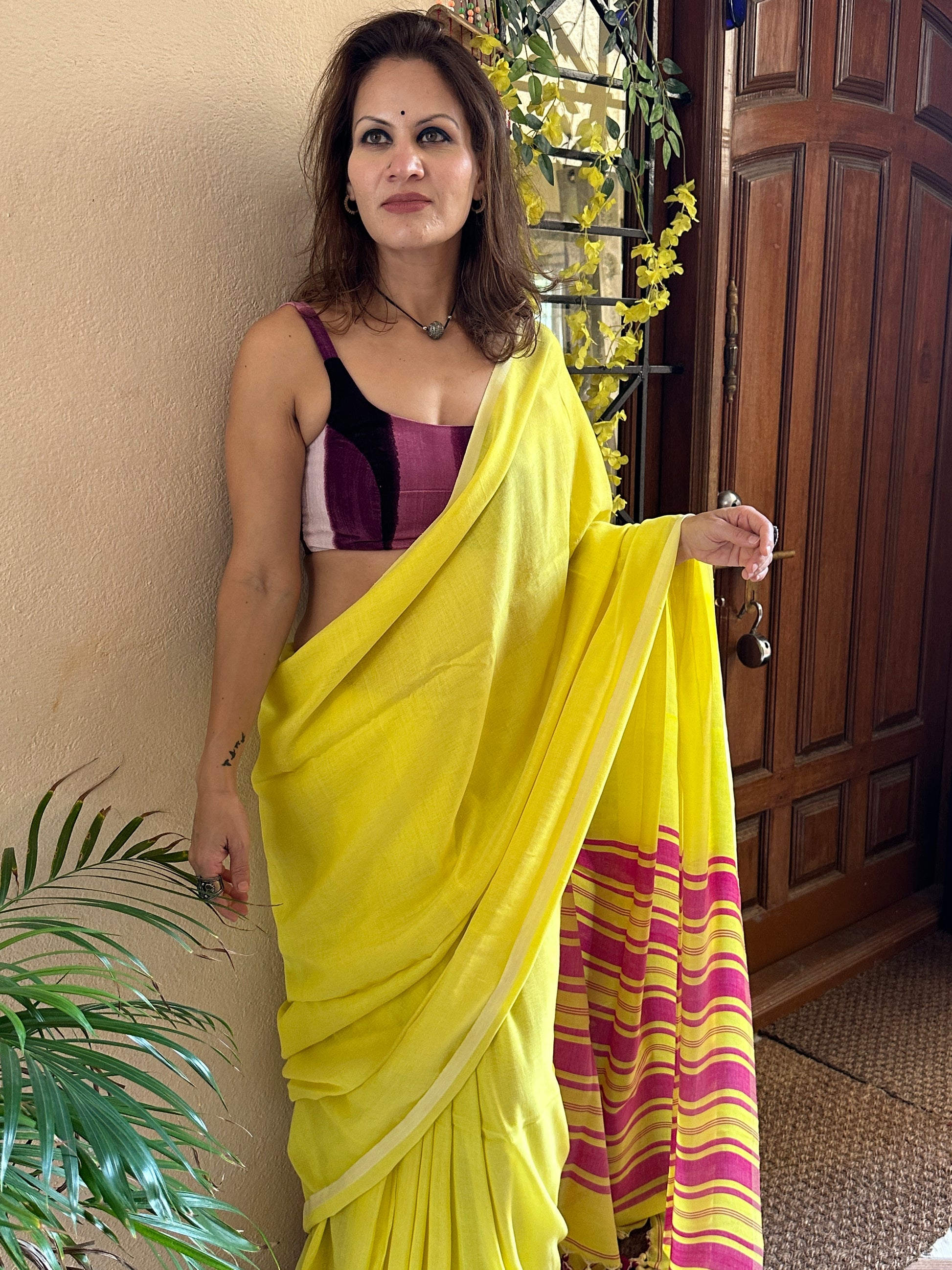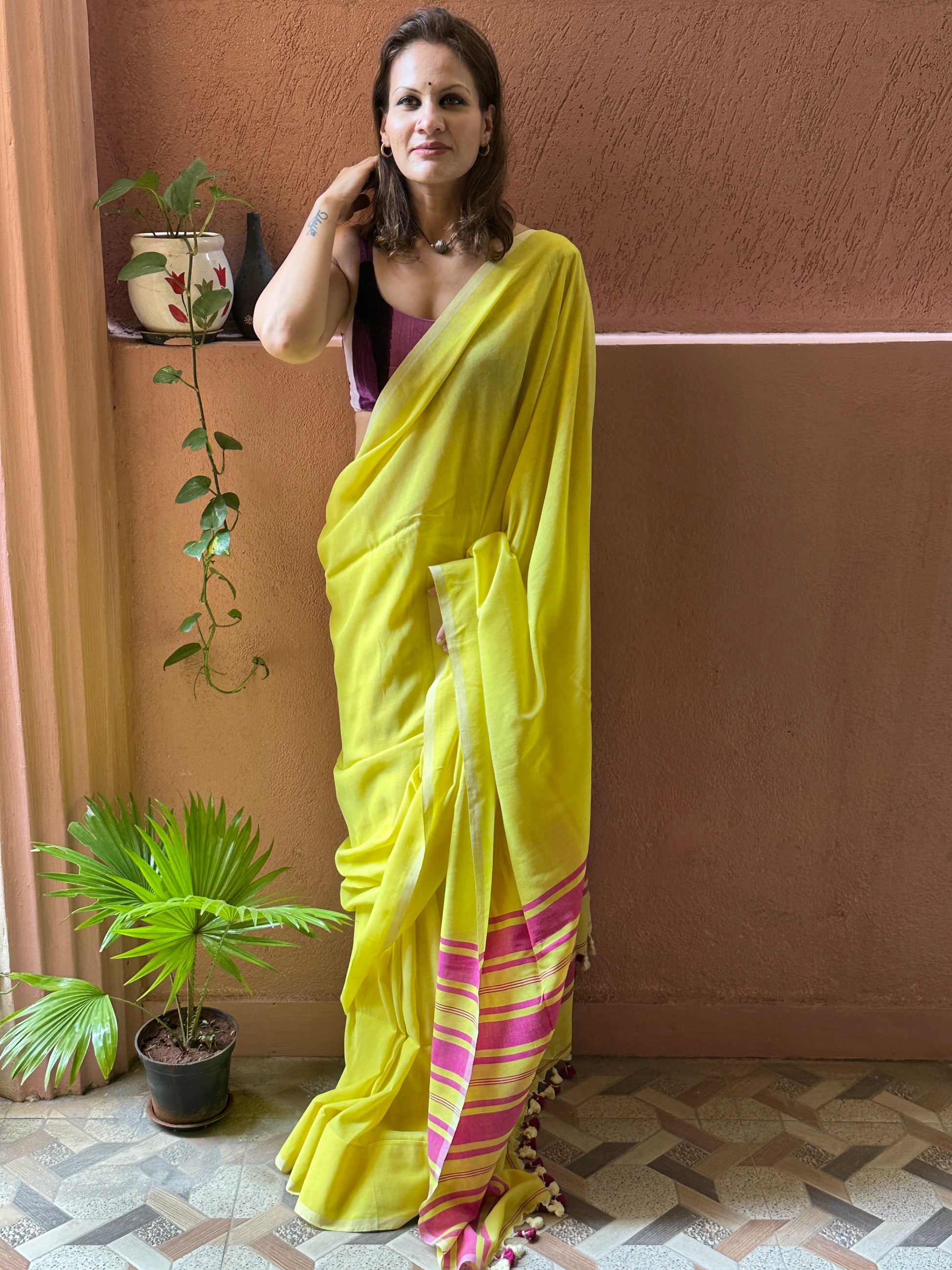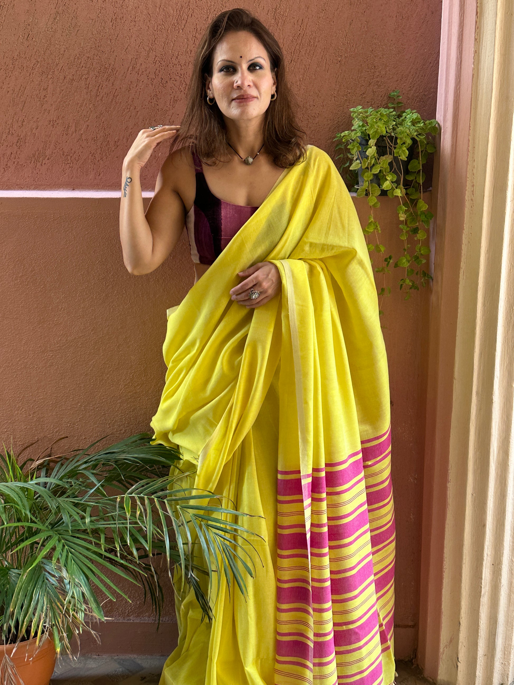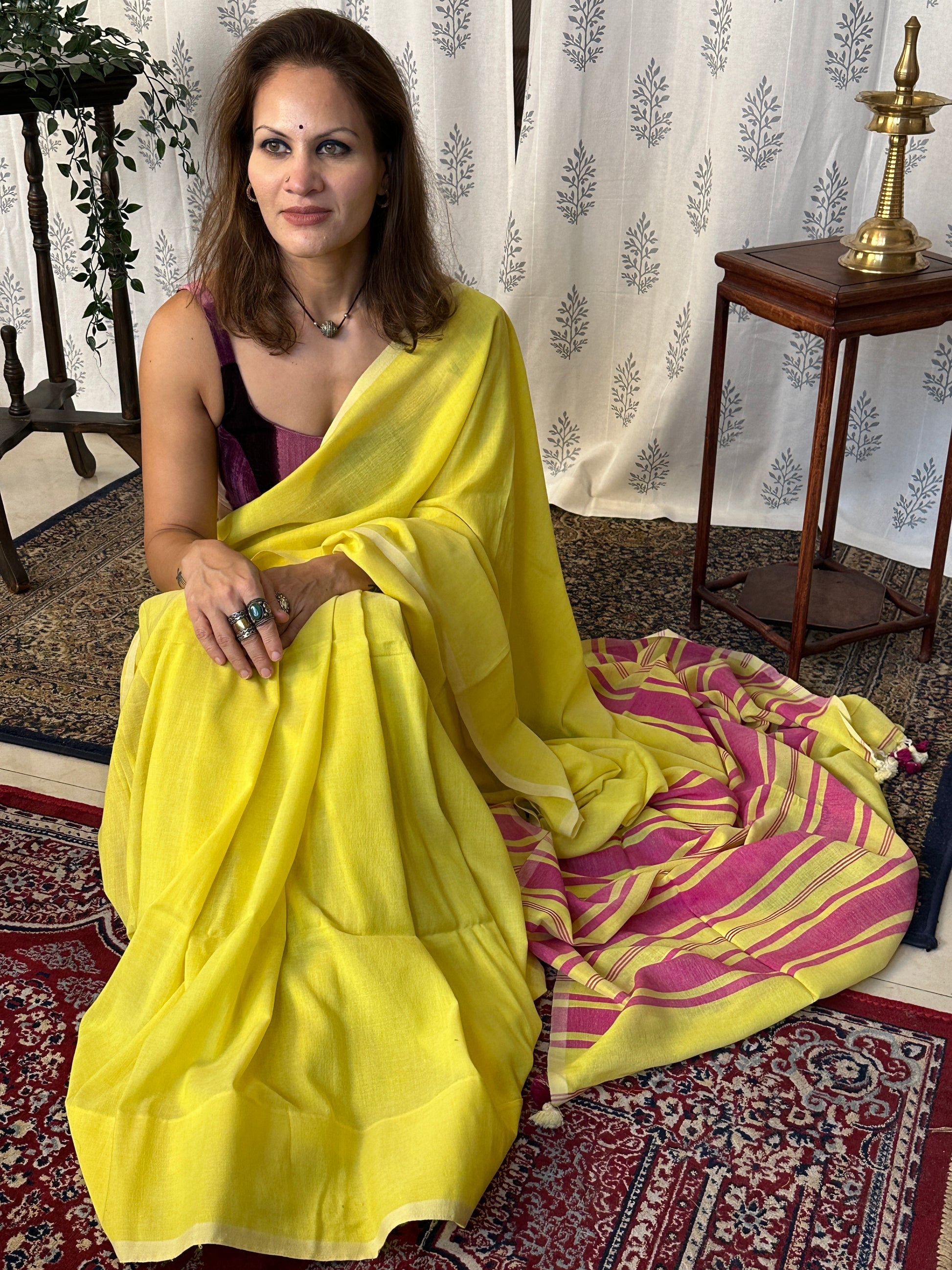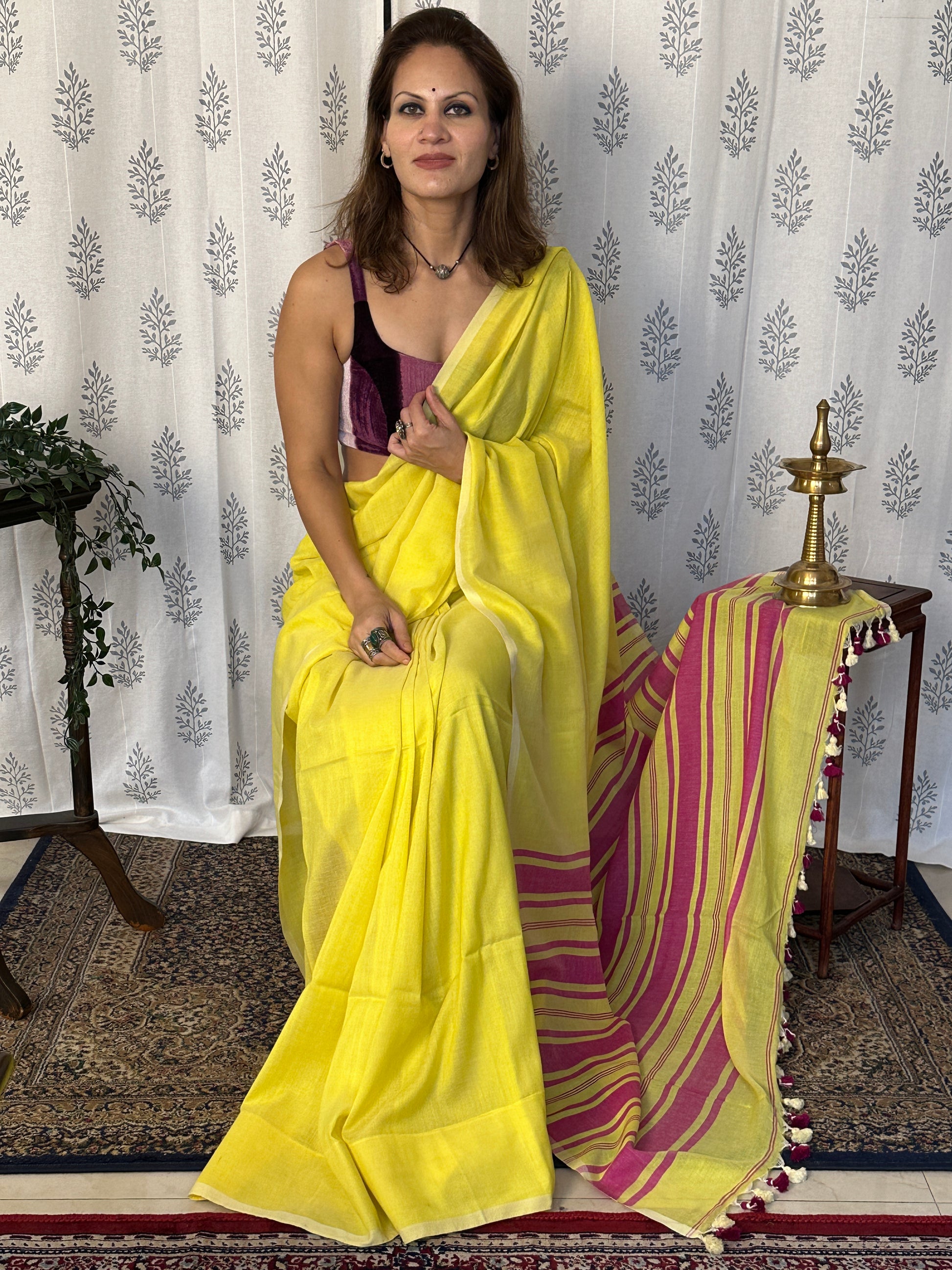 Experience the perfect combination of softness and style with a luxurious cotton and wool blend. The pallu of this sari is adorned with beautiful handmade tassels that are sure to elevate your entire look!