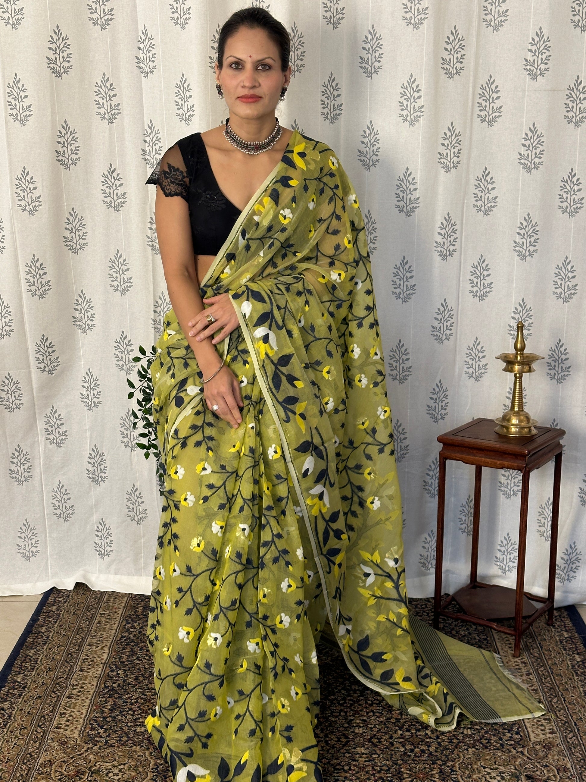 Yellowish Green Cotton Silk Jamdani Saree with Blue & Yellow Floral Design & Zari Work